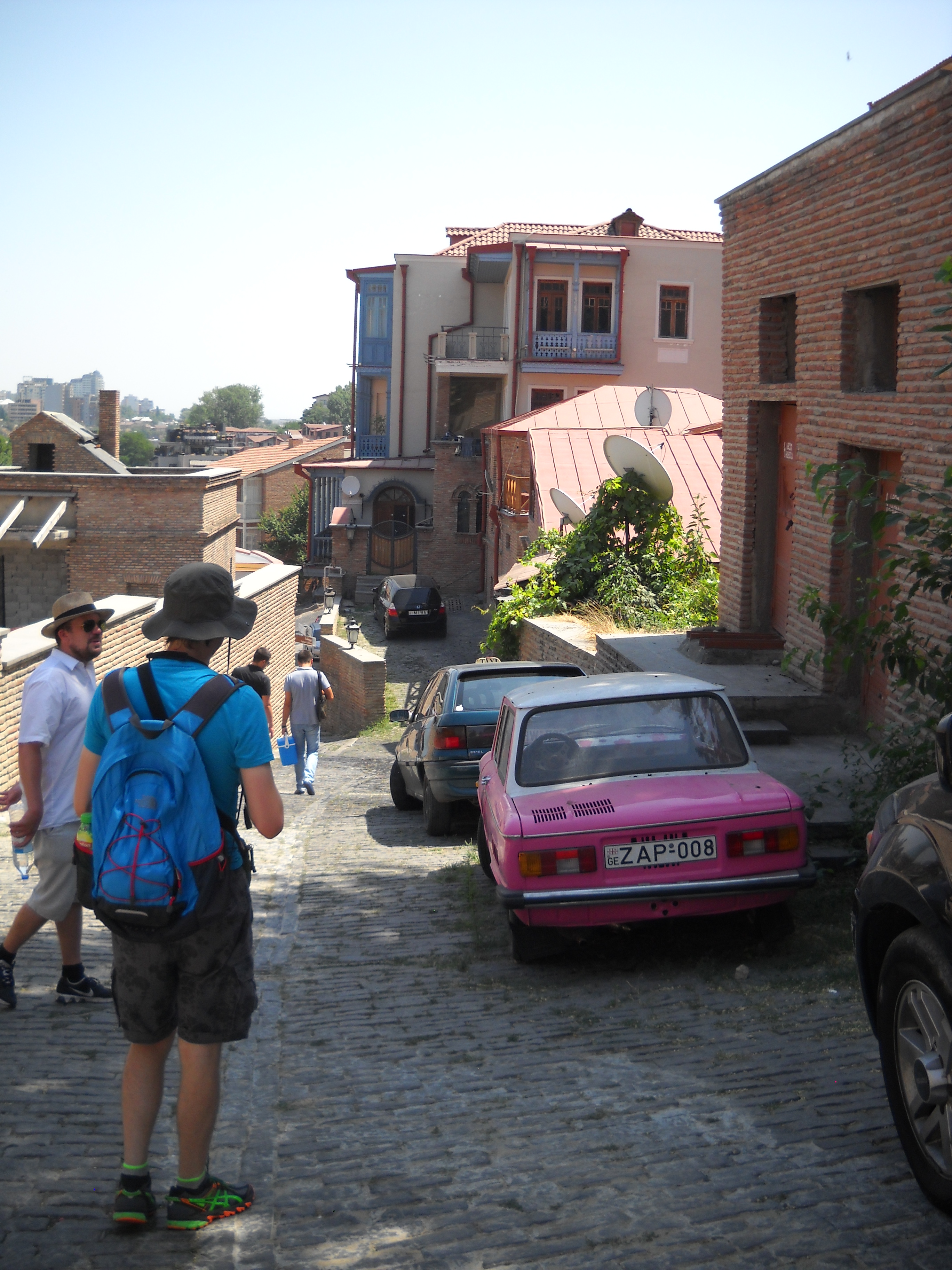 Durante il primo giro di ricognizione nella capitale capisco subito che i georgiani sono ospitali e si prendono cura dei turisti, aiutandoli se in difficoltà. L’unico problema è la lingua: o non parlano inglese, o lo parlano, ma hanno una pronuncia poco comprensibile. Le difficoltà maggiori le abbiamo avute con i tassisti: non c’era verso di farsi capire, le abbiamo provate tutte, anche la lingua dei segni, niente. Riuscivamo ad arrivare approssimativamente in un luogo d’interesse vicino a quello che volevamo visitare, ma ogni volta perdevamo parecchio tempo. La soluzione è farsi scrivere in georgiano quello che si vuole visitare o la via in cui si trova. Altrimenti, noleggiatevi una Lada, se ne vedono parecchie in giro (quella rosa è mia, sappiatelo).
