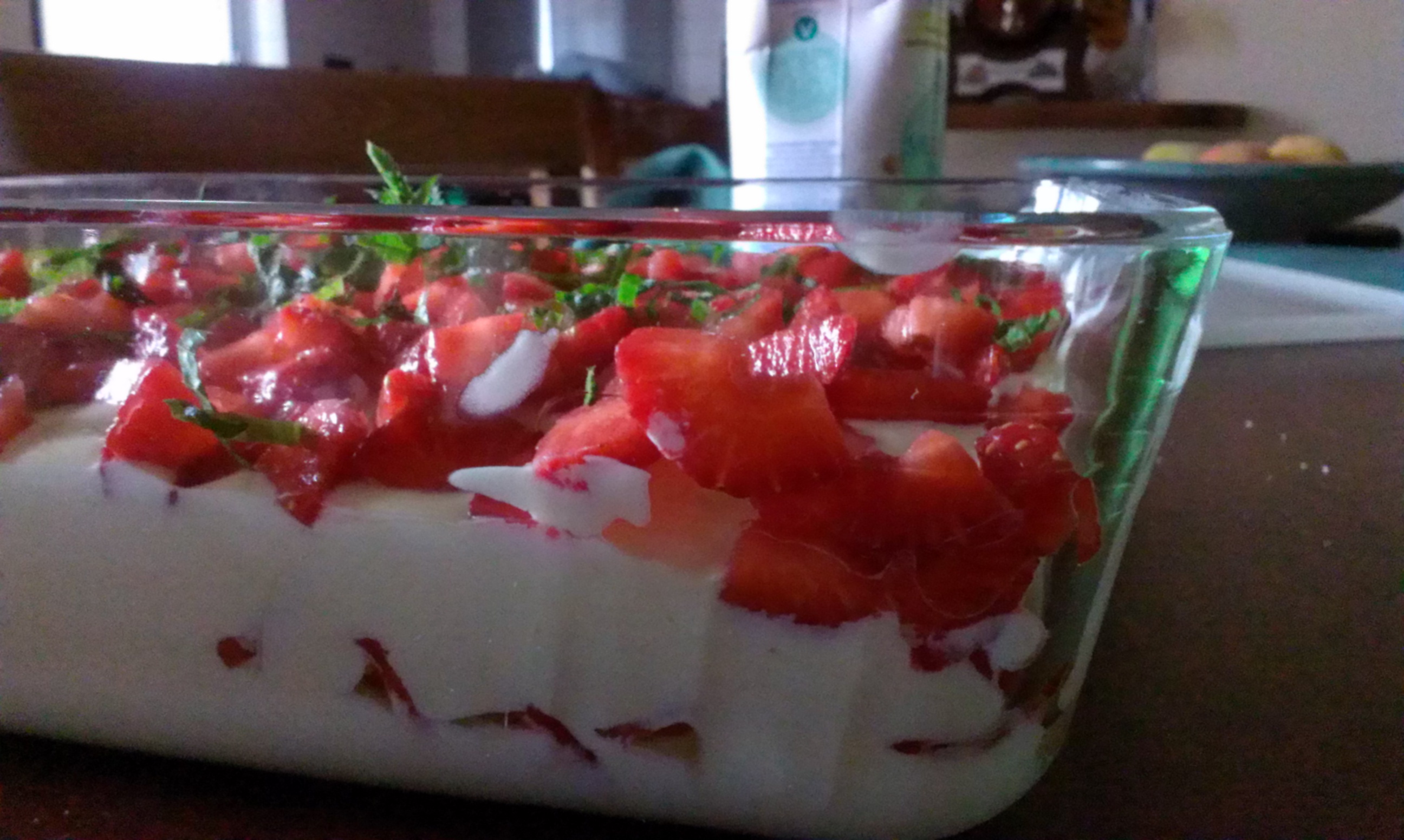 7) spezzettate le foglioline di menta sull’ultimo strato di fragole, rimettete in frigo per una mezzora e gustatevi il dolce e soffice tiramisù!